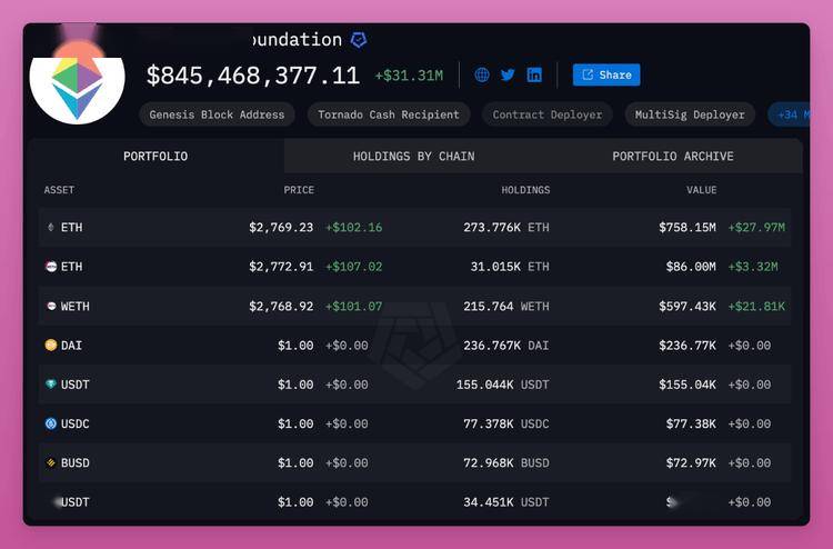 以太坊基金会持有价值8.45亿美元的ETH,占ETH总供应量的0.25%。