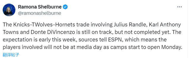 北京时间9月30日,据ESPN记者Ramona Shelburne报道,涉及唐斯的三方交易目前仍在进行中,预计将在本周初正式完成。这意味着交易中所涉及到的球员,都无法参加各自球队的媒体日活动以及新赛季的第一天训练营。
